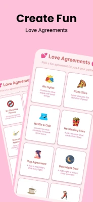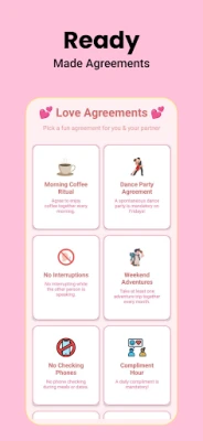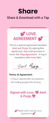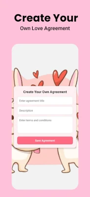 Create a personalized love agreement with your partner in minutes! Whether you're looking to set fun goals, establish ground rules, or simply strengthen your relationship, Love Agreement offers a playful and engaging way to do it. Perfect for couples who want to create a meaningful connection while having fun.