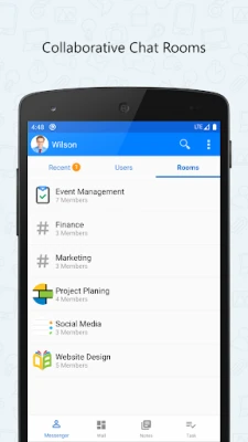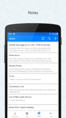 This Android Mobile app extends the power of Output LAN Messenger to your Smartphone & Tablet bringing Instant Messaging, Group Chat, File Transfer and several other features. Software features are tailor made to improve collaboration between teams to work together efficiently within office campus's and remote sites. The On-premises server and high level encryption technology ensures privacy and confidentiality for internal communication in the small, medium and corporate environments, hospitals with HIPAA regulations, and in the government and banking sectors.