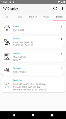 PV Output Display is an app to view data on the PV Output website. You can view live solar panel data and browse through historical data. The data is presented in five different tabs in both graphical and tabular form. Compare data with previous time ranges.